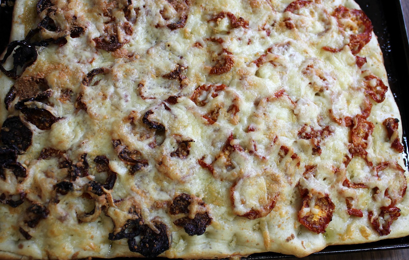 The cheesy focaccia was very tasty with the herbs and cheese combination.  It was good the second, even cold.  The tomato one would have been a great addition to a spaghetti dinner.  The water dehydrated tomatoes turned out to be similar in taste to using fresh tomatoes.  The ones I soaked in oil tasted better but burned more easily because they weren't so moist.  So I have a dilemma next time I try it in how to do the tomatoes.