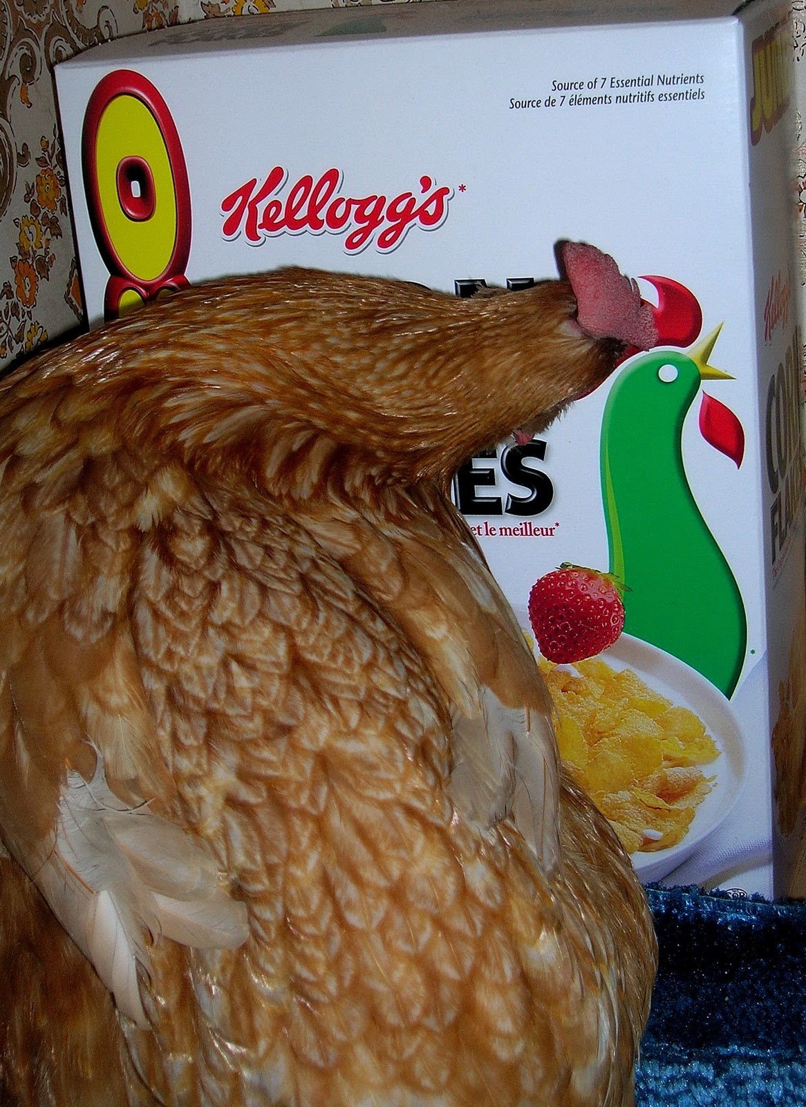 "Oohh, you have flakes, corn flakes . . . I love corn. Will you share?" asks Lulu as she pecks the box. "Boy, you sure are the strong, silent type!"